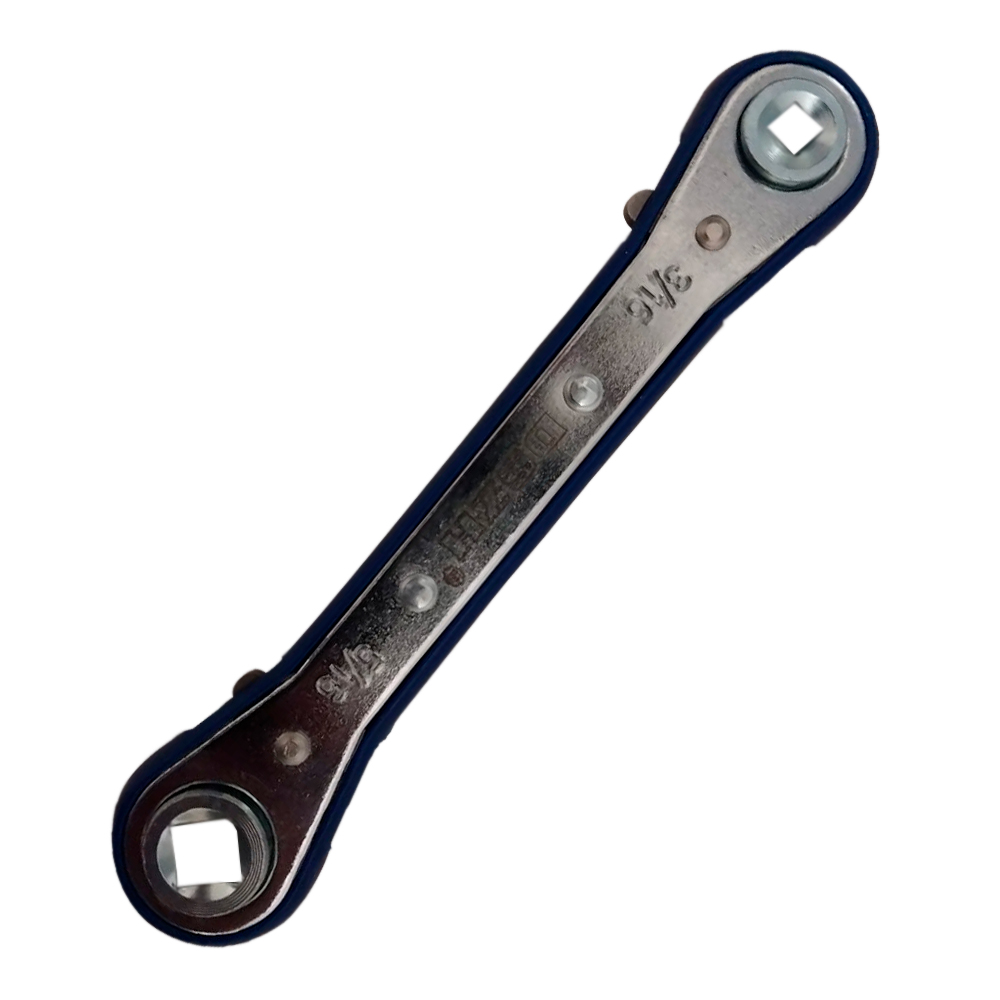 Chave catraca permite o aperto e abertura em válvulas de condicionadores de ar de grande porte (acima de 36.000 BTUs/h) e cilindros de refrigeração (35 / 60Kg). As chaves possuem catraca, facilitando sua utilização mesmo em ambientes com espaço reduzido. Estas chaves são compatíveis com 4 diâmetros de válvulas, de 1/4,3/8,3/16,5/16 sendo dupla a cada um de seus lados, fornecendo diversas soluções em um tamanho compacto.